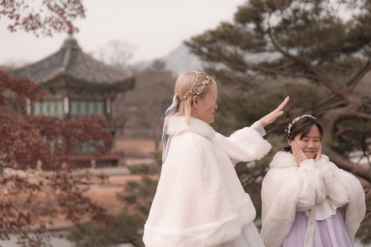They were a husband-and-wife couple that loves to shoot humans. I dm-ed them on Instagram and the booking was super fuss-free. They have a few “package-offers” . We were easily hooked on to the idea of dressing up in hanboks and acting like princesses. We planned for a 1hour shoot at Gyeong Bok Gong and voila!